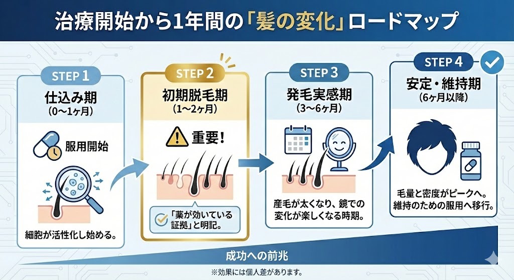 「抜け毛が増えたから」と怖くなって服用を中止するのは、最も避けるべき選択です。